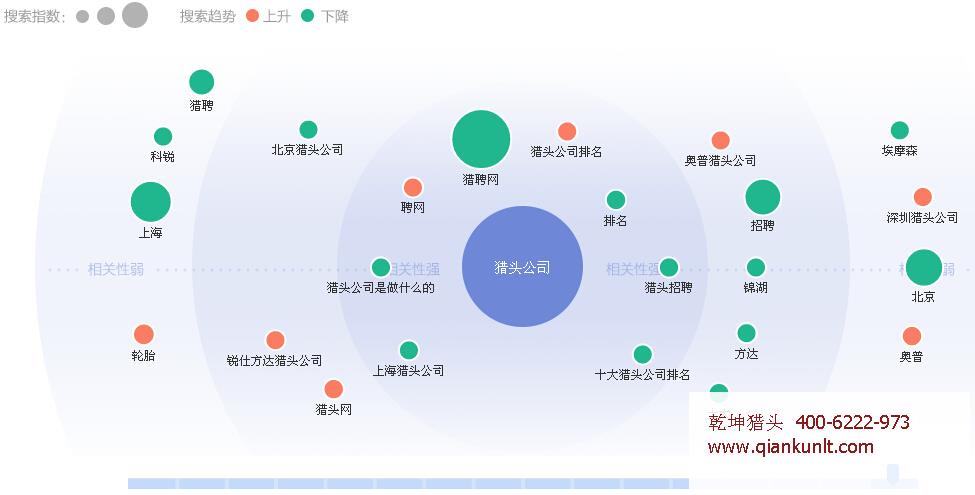 北京知名獵頭公司乾坤獵頭通過百度大數(shù)據(jù)平臺,分析了全國范圍內的百度用戶在2015-11-09 至 2015-11-15期間,通過百度搜索關鍵詞獵頭公司一詞的需求情況,得出的上圖,圖中大圓表示強烈,小圓表示相反,綠色表示在下降,紅色表示在上升,越靠近中間獵頭公司一詞,相關性越強,反之越弱。